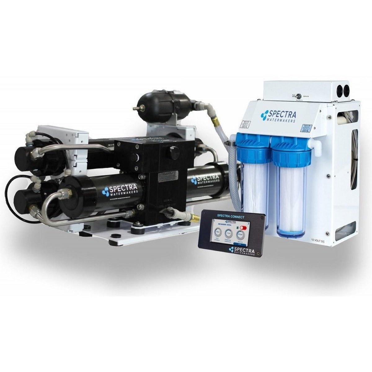 The Newport 400c Compact operates on as little as 15 watts per gallon (4 watts per liter), making it possible to run your system on a small generator, solar, wind, batteries. Multi-speed capacity allows machine operation on high mode for maximum product flow or low mode for maximum efficiency, making it ideal for onboard power management. The system will automatically switch to low mode to extend the prefilter life in challenging feed water. The Spectra Connect allows you to operate and monitor your watermaker from a remote device, and has new added features like the Fill Tank mode, or a customizable Auto Run mode, One-Touch Sensor Calibration, and suggested maintenance intervals displayed on the dashboard. Two 20” membranes are utilized in the 400c Compact model for maximum space efficiency.