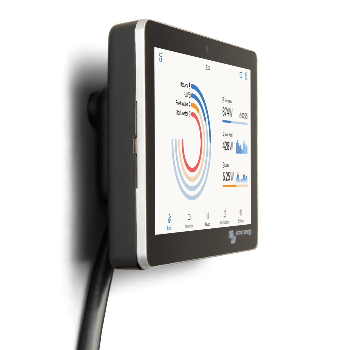 The GX Touch is optimised to more than meet the standards of installer professionals. The screen is simply bolted on top of a dashboard, eliminating the need to create perfect cut-outs (like with the Color Control GX). It can also be mounted flush or even embossed with the unlaying surface and connected through just one cable, taking away the hassle of having to bring many wires to a dashboard.
