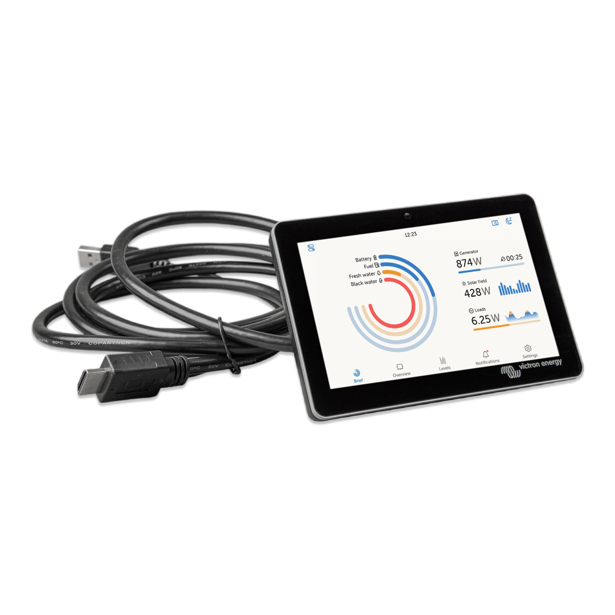 The GX Touch is a companion to the Cerbo GX. This communication-centre allows you to always have perfect control over your system from wherever you are and maximises its performance. Simply connect through our Victron Remote Management (VRM) portal, or access directly, using the GX Touch, an MFD or our VictronConnect App thanks to its built-in WiFi Access Point. This latest addition to the GX-range combines all the best of connectivity, redefining smart power solutions in every way.