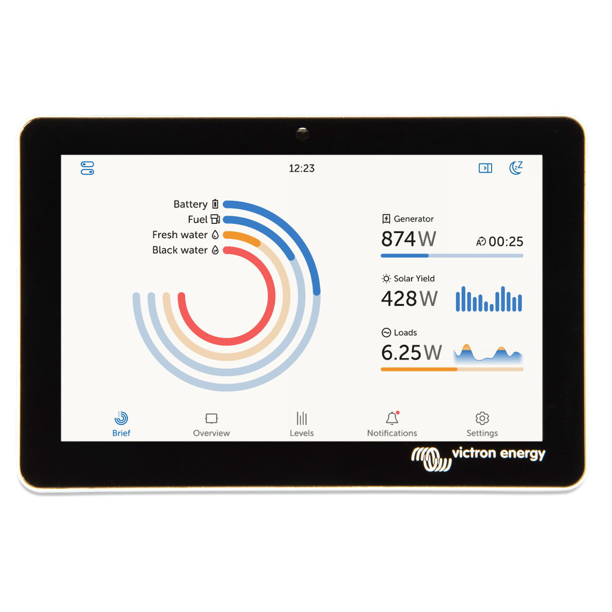 The GX Touch is a companion to the Cerbo GX. This communication-centre allows you to always have perfect control over your system from wherever you are and maximises its performance. Simply connect through our Victron Remote Management (VRM) portal, or access directly, using the GX Touch, an MFD or our VictronConnect App thanks to its built-in WiFi Access Point. This latest addition to the GX-range combines all the best of connectivity, redefining smart power solutions in every way.